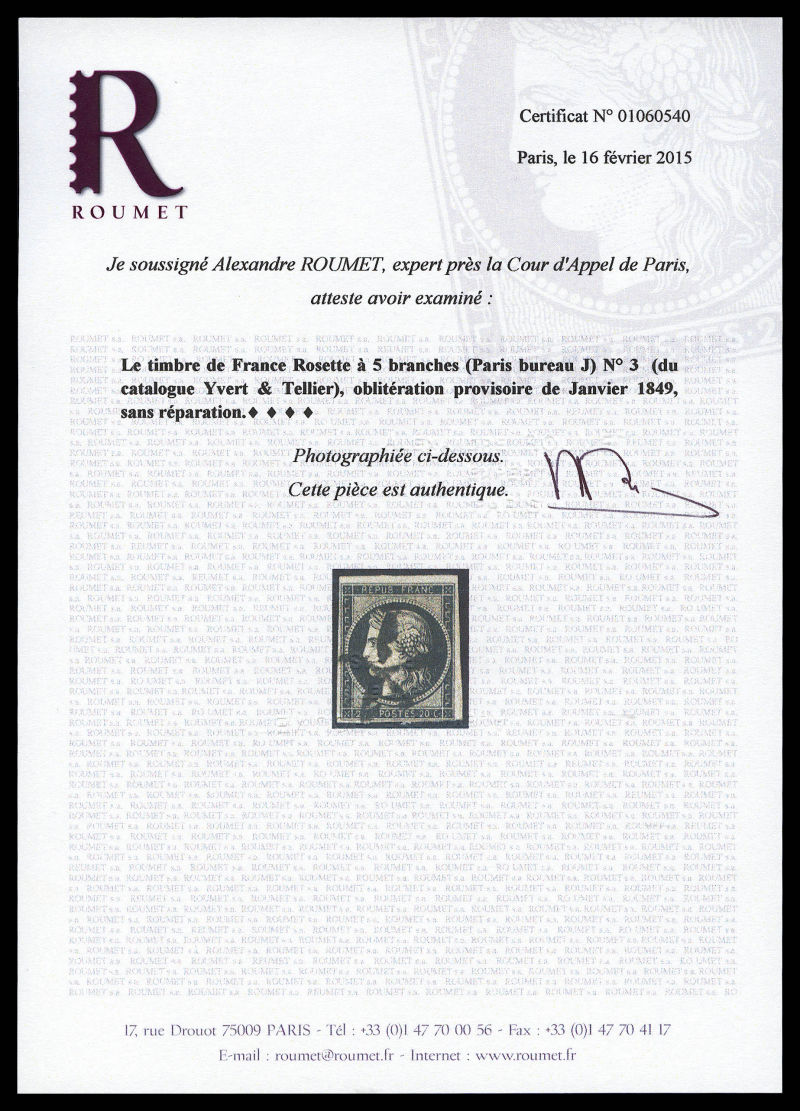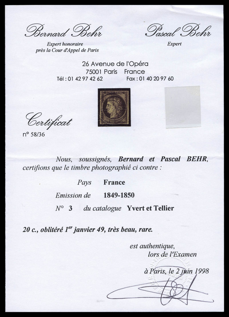 69 imageN°3, 20c noir Obl Càd Type 14 de janvier 1849 + plume, TB (certificat) Qualité: Oblitéré Cote: 450 euros (Image)