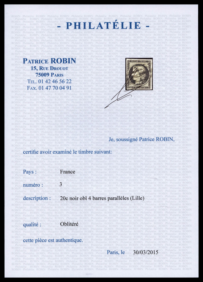 70 imageN°3, 20c noir obl 4 Barres de Lille. SUPERBE. R.R. (signé Calves/Brun/certificat) Qualité: Oblitéré Cote: 3250 euros (Image) (image2) (image3) (All Images)