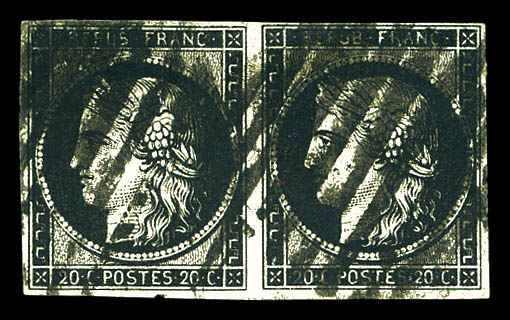 71 imageN°3, 20c noir en paire oblitération barres de Lille en cercle. SUP. R. (signé Calves/certificat) Qualité: Oblitéré Cote: 3500 euros (Image) (image2) (All Images)
