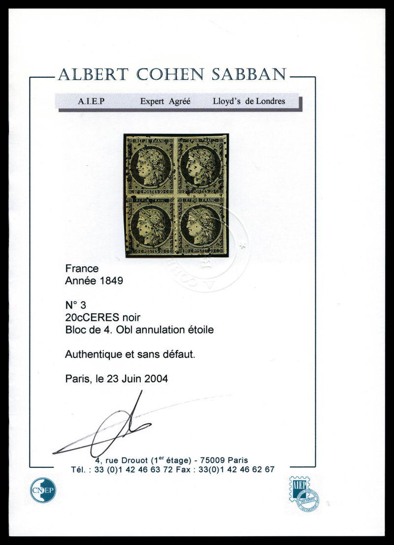 74 imageN°3, 20c noir sur jaune en bloc de quatre oblitération étoile, quatre belles marges. SUPERBE. R.R. (signé Calves/certificat) Qualité: Oblitéré Cote: 5500 euros (Image) (image2) (image3) (All Images)
