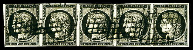 75 imageN°3, 20c noir sur jaune, bande de cinq, bien margée, obl. grille, TB. Signé Calves Qualité: Oblitéré Cote: 1700 euros (Image)