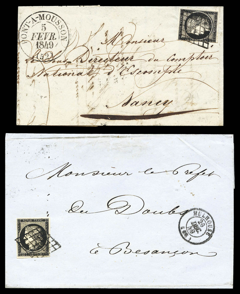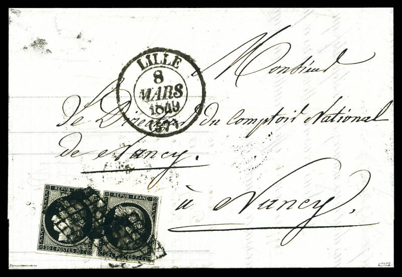 77 imageN°3, 20c Cérès en paire obl grille + càd type 13 de LILLE le 8 mars 1849 sur lettre pour NANCY, au verso càd de passage + arrivée le 12.3. TTB. R. (certificat) Qualité: Oblitéré (Image) (image2) (All Images)