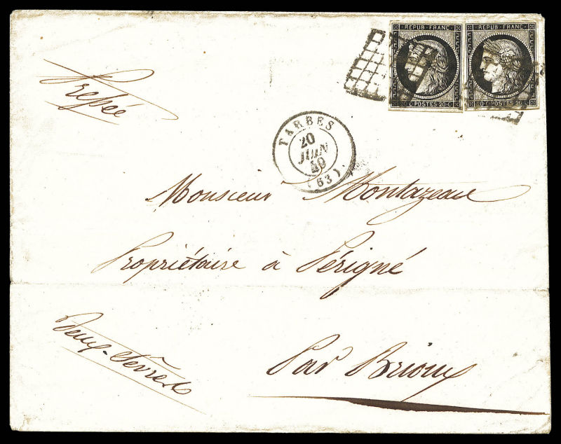 79 imageN°3, 20c Noir, 2 exemplaires, OB grille, C. TARBES (type 15) sur enveloppe au double port pour Brioux 1849 TB Qualité: Oblitéré (Image)