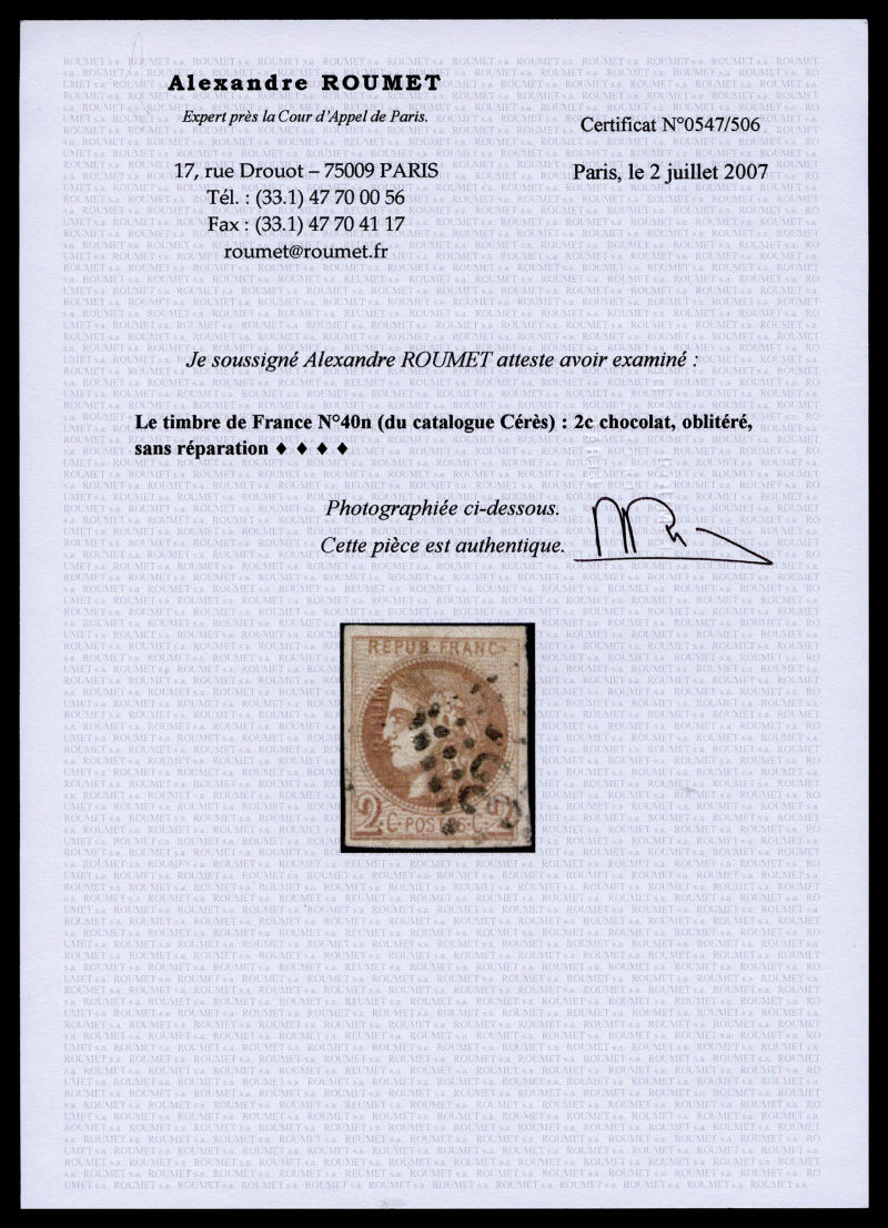 781 imageN°40Bg, 2c Chocolat Report 2, belle nuance. TTB (signé/certificats) Qualité: Oblitéré Cote: 1100 euros (Image) (image2) (All Images)