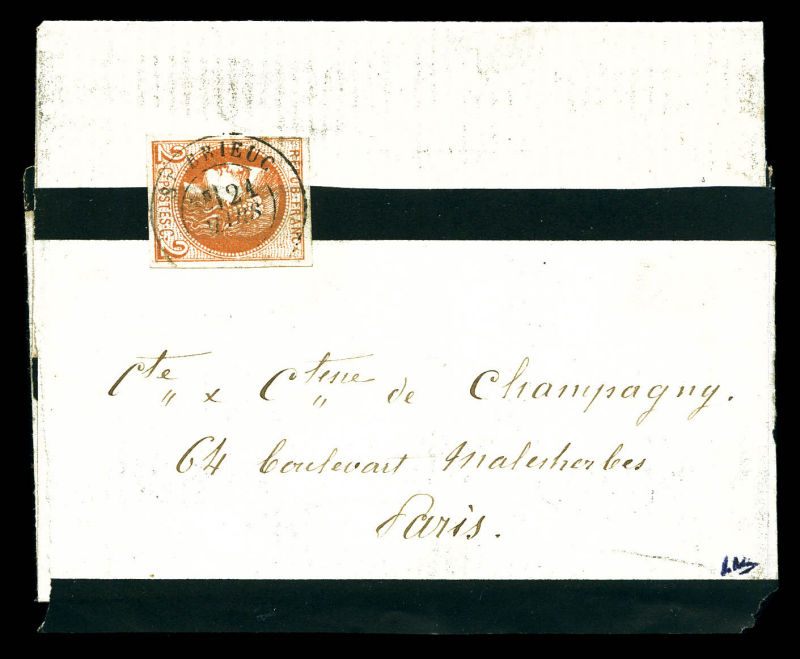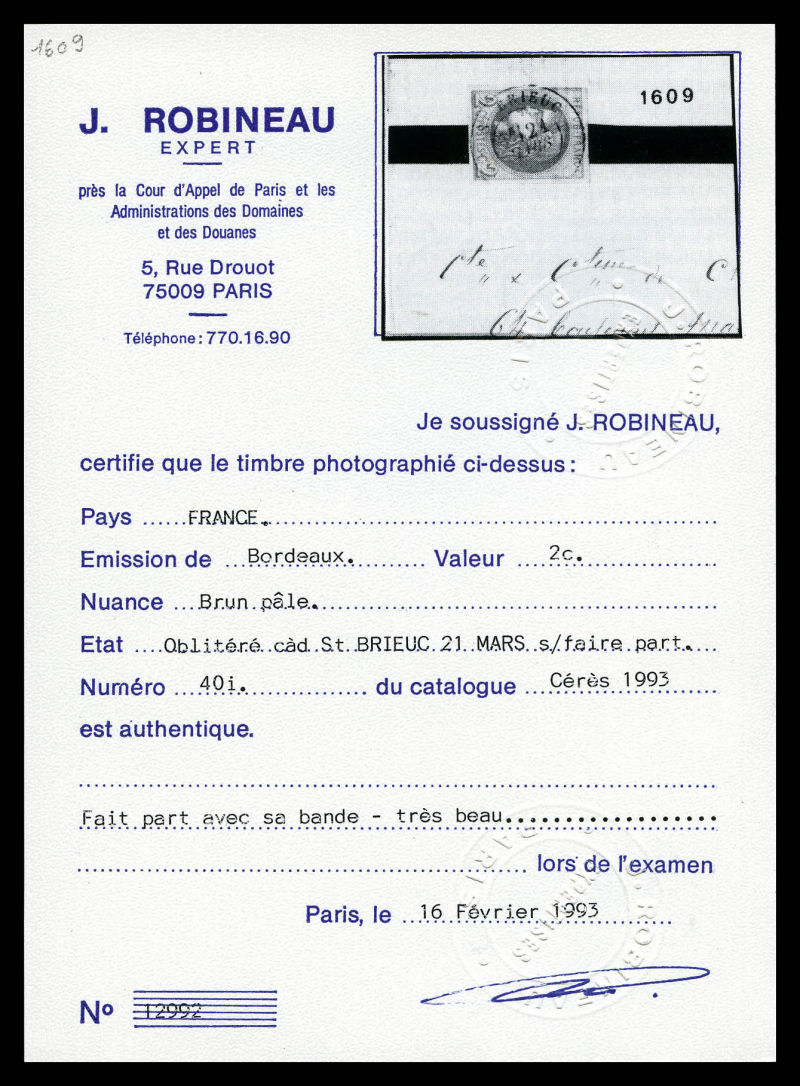 782 imageN°40Bl, 2c brun clair Report 2 obl càd de ST BRIEUC seul sur faire part complet pour Paris. TTB. R.R. (signé Robineau/certificats) Qualité: Oblitéré Cote: 6500 euros (Image) (image2) (All Images)