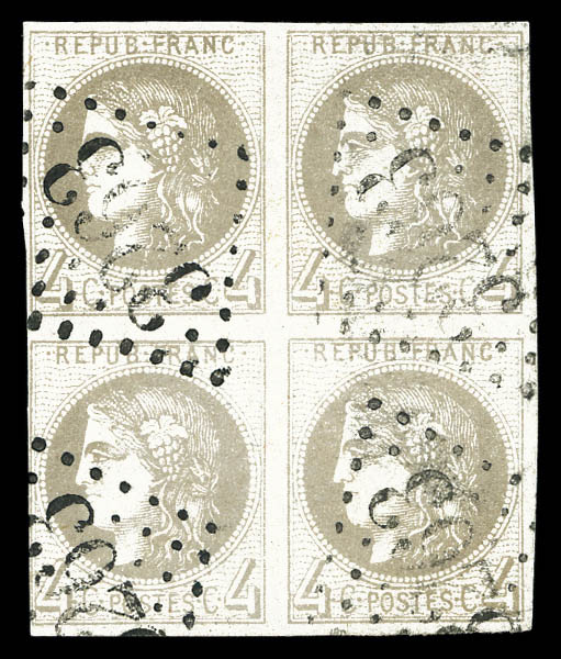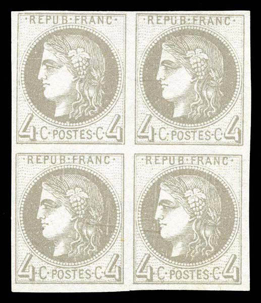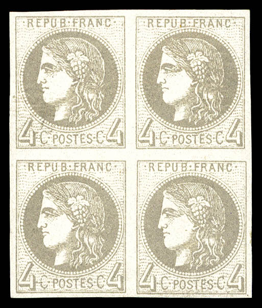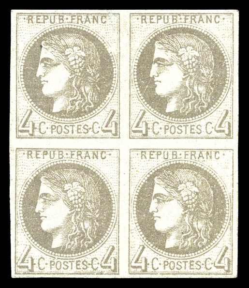792 imageN°41A, 4c gris Report 1 en BLOC DE 4, PROBABLEMENT LE PLUS BEL EXEMPLAIRE CONNU, GRANDE RARETÉ, SUPERBE (certificats) Qualité: (*) Cote: 30000 euros (Image)