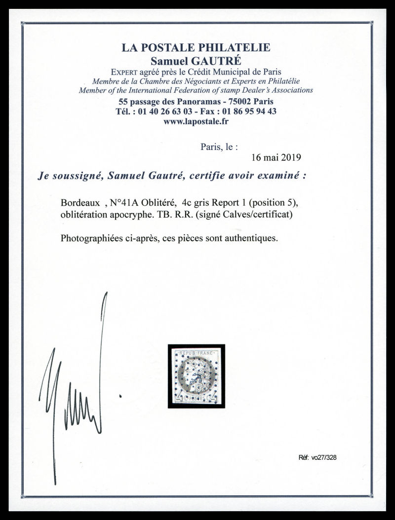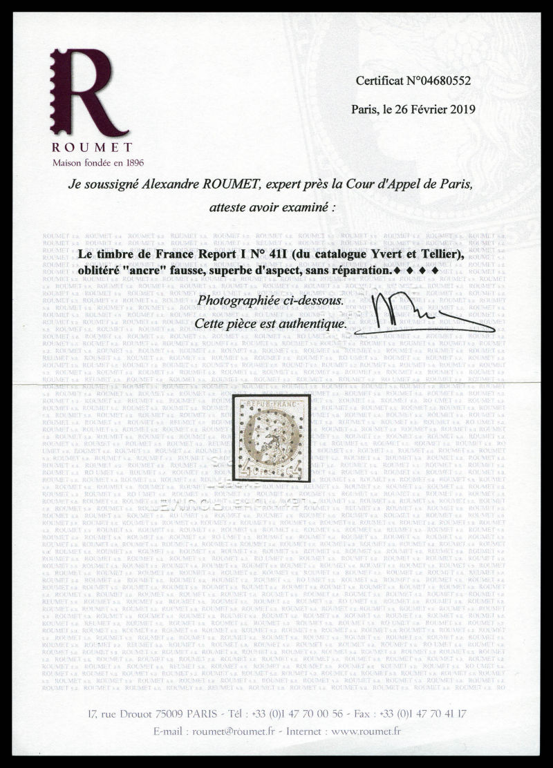 795 imageN°41A, 4c gris Report 1 (position 5), oblitération apocryphe. TB. R.R. (signé Calves/certificat) Qualité: Oblitéré Cote: 2600 euros (Image) (image2) (image3) (All Images)
