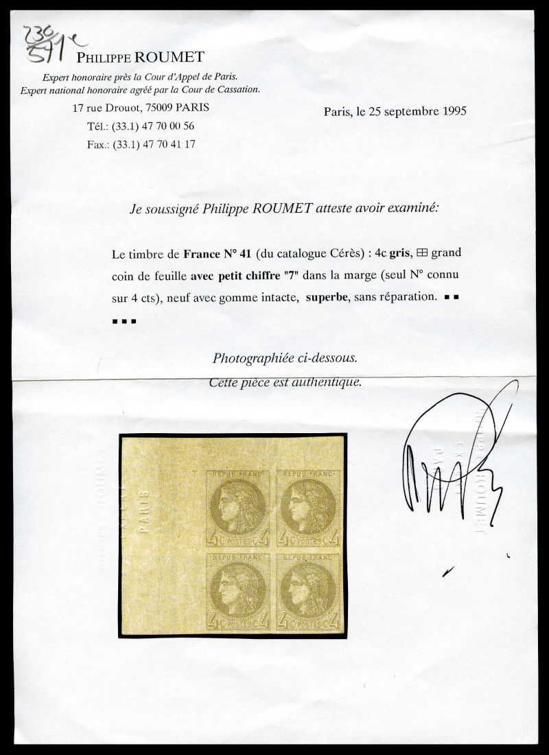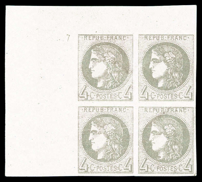 797 imageN°41B, 4c gris Report 2 en bloc de quatre grand coin de feuille avec PETIT CHIFFRE '7', RARE et SUPERBE (signé Calves/Baudot/certificats) Qualité: ** (Image) (image2) (All Images)