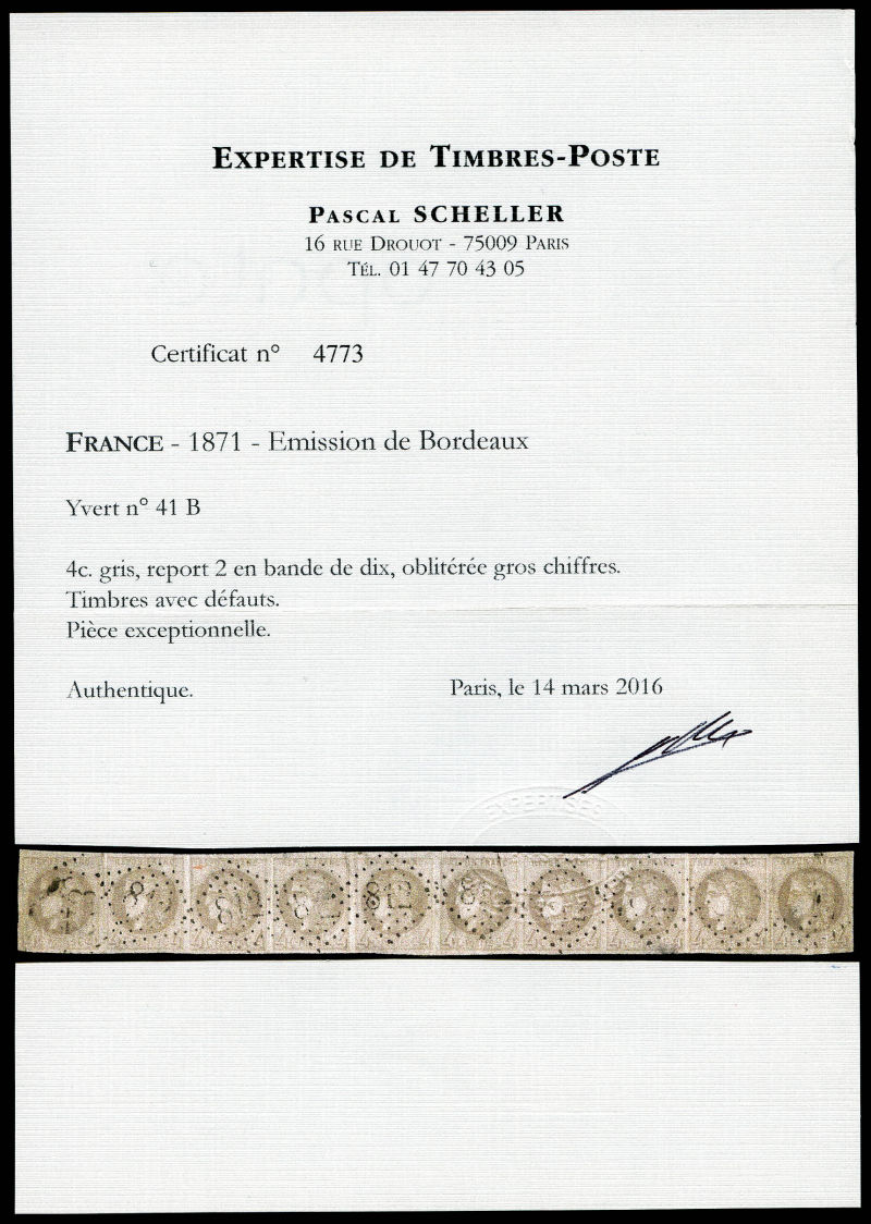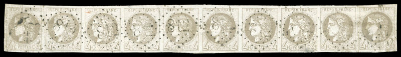 799 imageN°41B, 4c gris report 2, exceptionnelle bande de dix oblitérée, de légers défauts, plus grande bande connue (ex collection Henri Thiaude) . SUPERBE. R.R.R (signée Scheller/certificats) Qualité: Oblitéré (Image) (image2) (All Images)