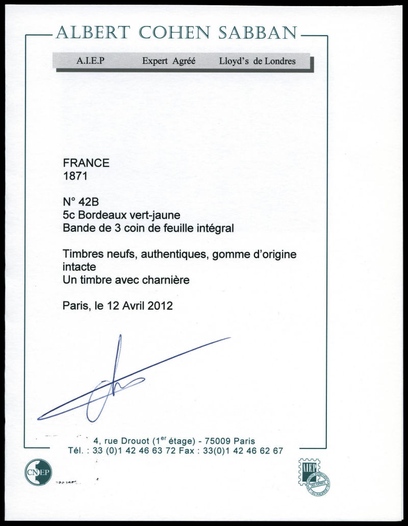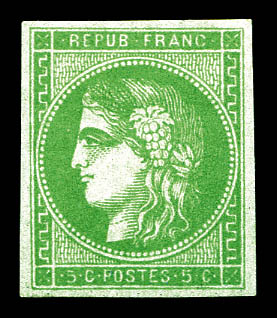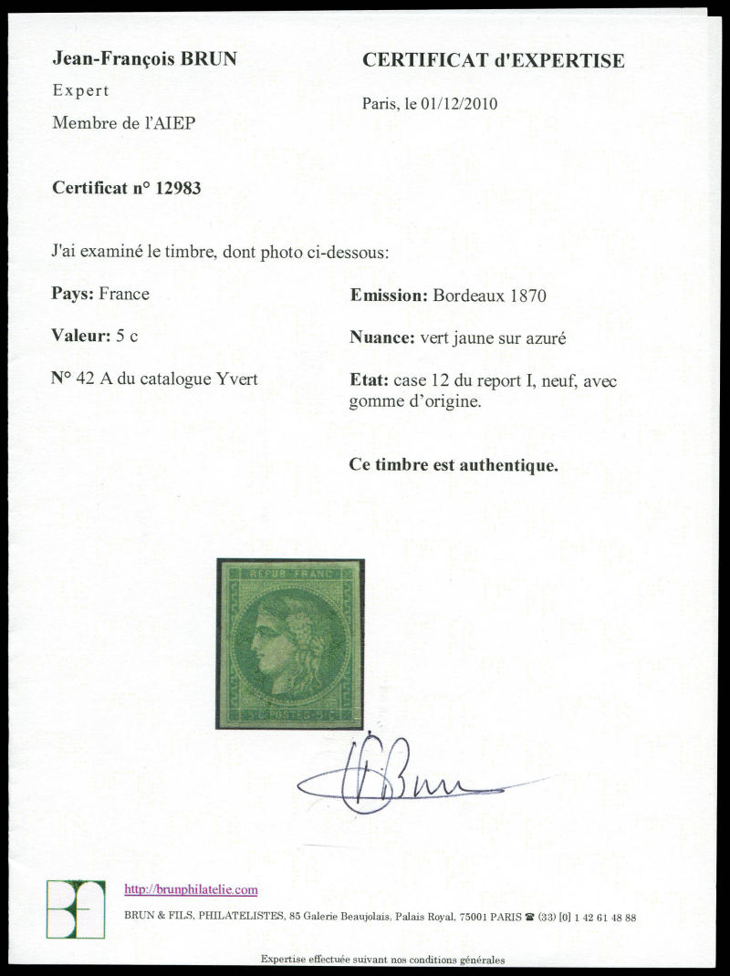 829 imageN°42B, 5c vert-jaune, grand bord de feuille, fraîcheur postale. SUP (certificat) Qualité: ** (Image) (image2) (All Images)