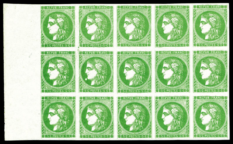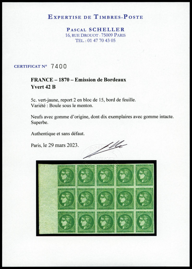 823 imageN°42B, 5c vert-jaune Report 2, bloc report complet de 15 exemplaires avec VARIETE BOULE SOUS LE MENTON (case 7), bord de feuille latéral (5ex*). SUPERBE. R.R. (certificat) Qualité: ** (Image) (image2) (All Images)