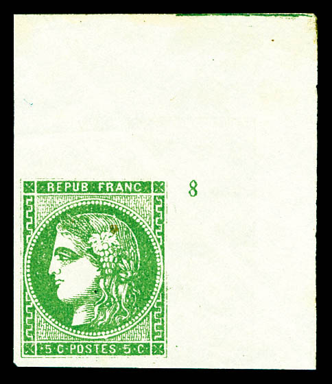 824 imageN°42B, 5c vert-jaune Report 2, coin de feuille intégral avec PETITS CHIFFRES '8' en marge, PIECE EXCEPTIONELLE. SUPERBE. R.R. (certificat) Qualité: ** (Image)