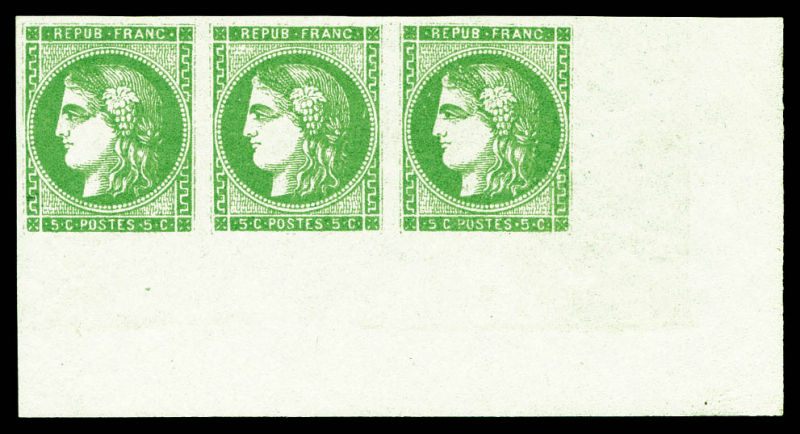 825 imageN°42B, 5c vert-jaune Report 2 en bande de 3 coin de feuille intégral (1ex*), fraîcheur postale. SUPERBE. R. (certificats) Qualité: ** (Image) (image2) (All Images)