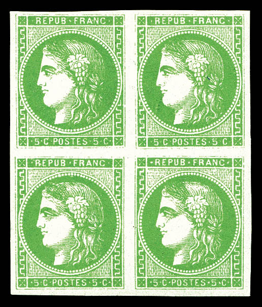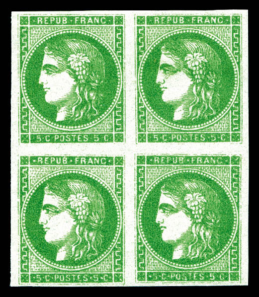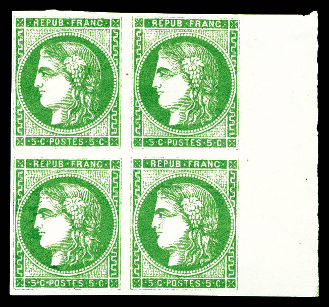 827 imageN°42B, 5c vert-jaune nuance soutenue, Report 2, impression empatée, en bloc de quatre grand bord de feuille latéral (2ex*), très frais. SUP. R. (certificat) Qualité: ** (Image) (image2) (All Images)