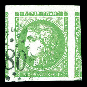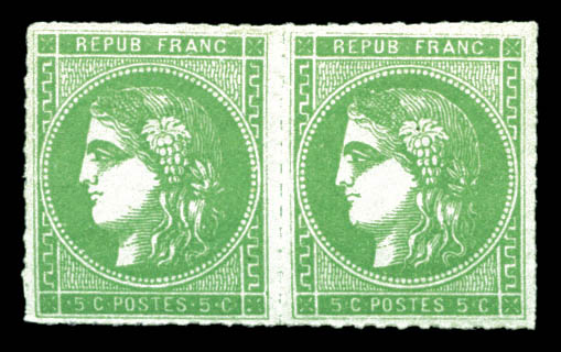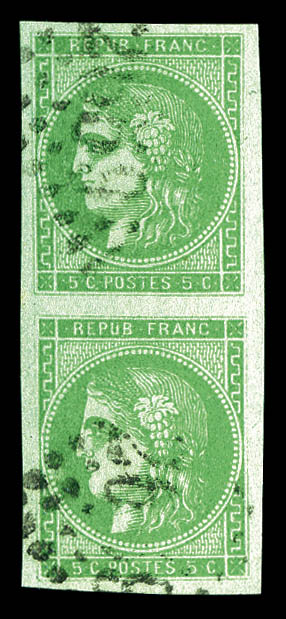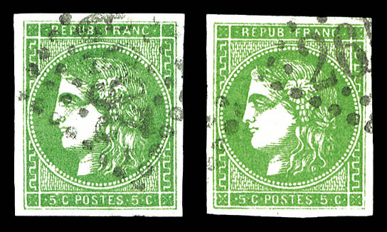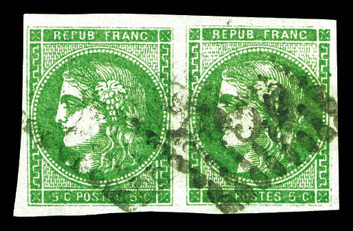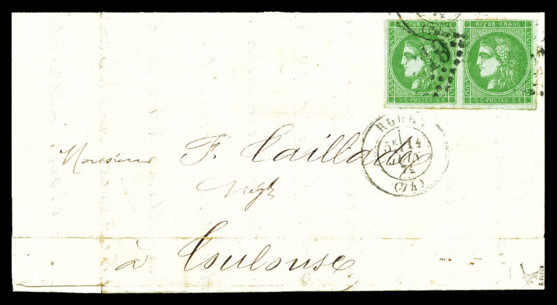 838 imageN°42B, 5c vert-jaune Rep 2 en paire seule obl GC + càd de ROUEN le 11 juin 1871 sur lettre pour Toulouse. TB Qualité: Oblitéré Cote: 1800 euros (Image)