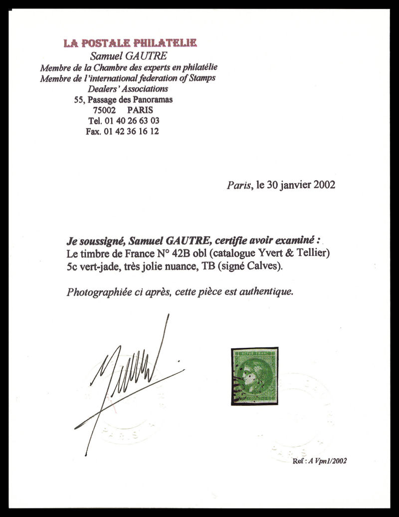 831 imageN°42B, 5c vert-jade, jolie nuance. TTB (signé Calves/certificat) Qualité: Oblitéré (Image) (image2) (All Images)