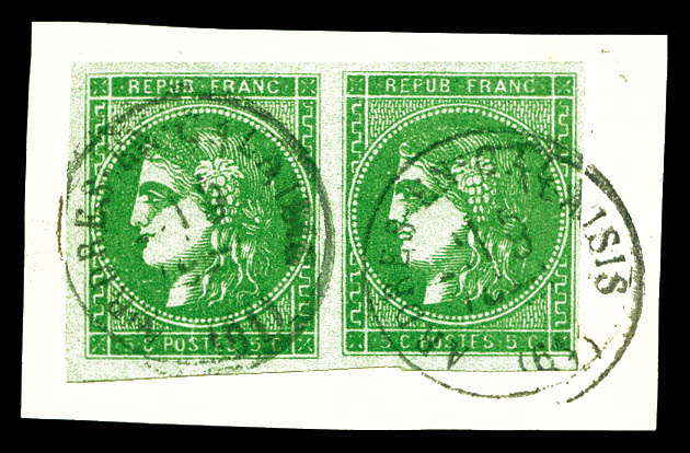 835 imageN°42B, 5c vert-jaune, paire obl. càd T17 Ardres-en-Calaisis (Pas-de-Calais) sur son support. TTB (certificat) Qualité: Oblitéré Cote: 560 euros (Image)