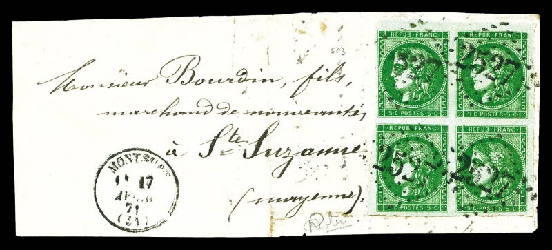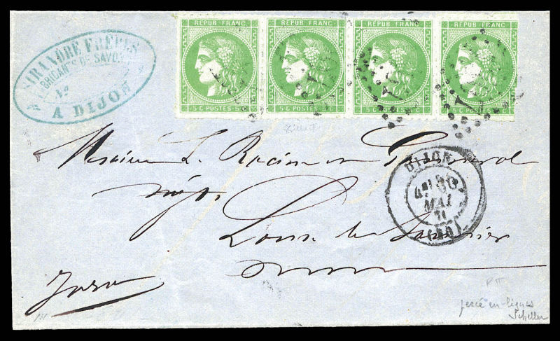 836 imageN°42B, 5c vert Rep 2 en bande de 4, PERCE EN LIGNE, OB GC, C. DIJON sur lettre pour Lons-le-Saunier 1871. SUP. R.R. (signé Scheller/certificat) Qualité: Oblitéré (Image)