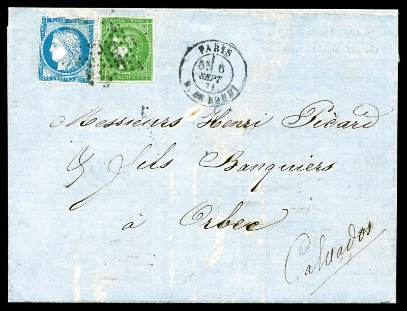 837 imageN°42B, Sept 1871, 5c bordeaux +20c siège (N°37) obl ETOILE CHIFFREE '5' et càd de PARIS le 6 sept 1871sur lettre pour Orbec, TB. R. (certificat) Qualité: Oblitéré Cote: 3200 euros (Image)