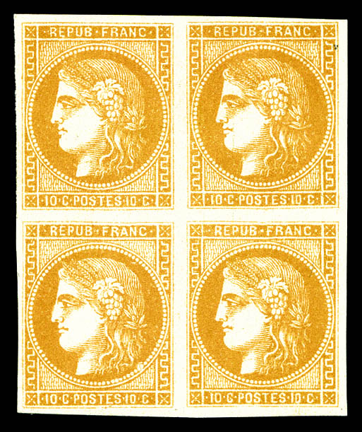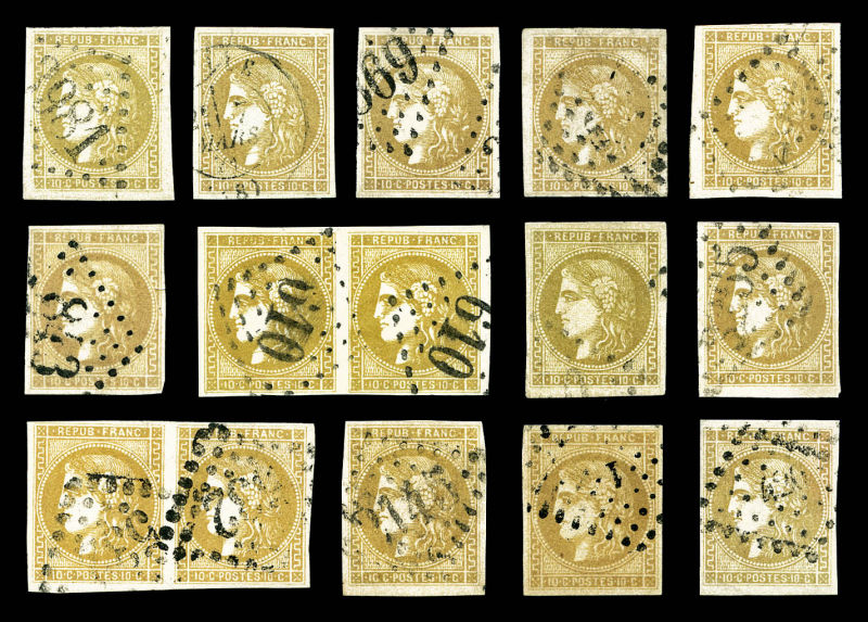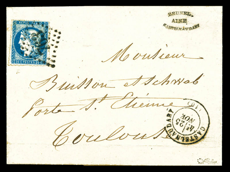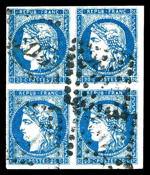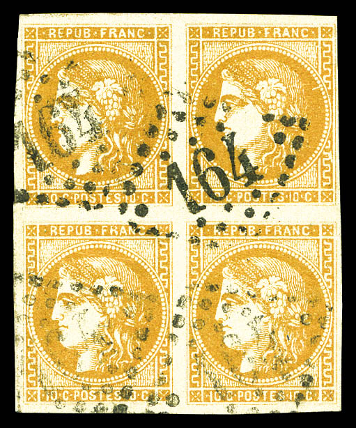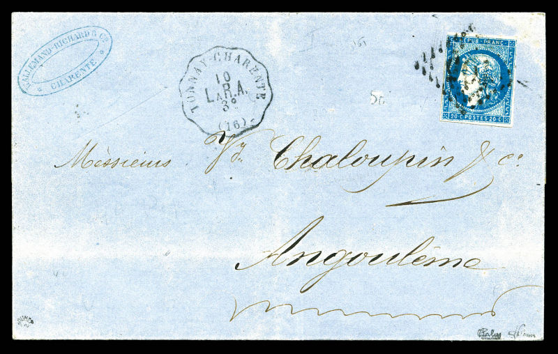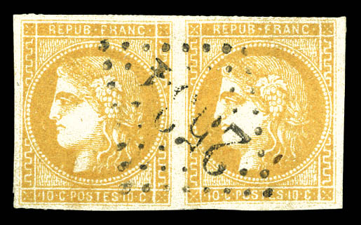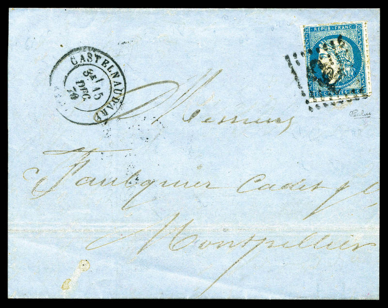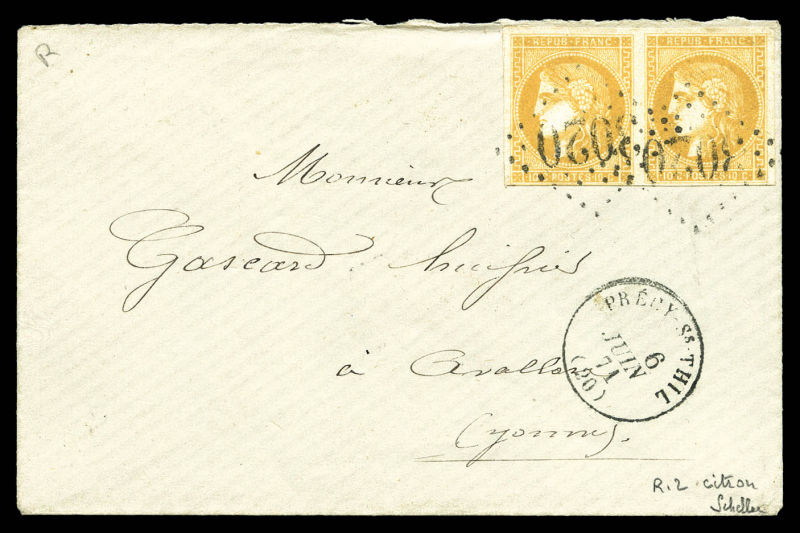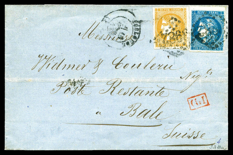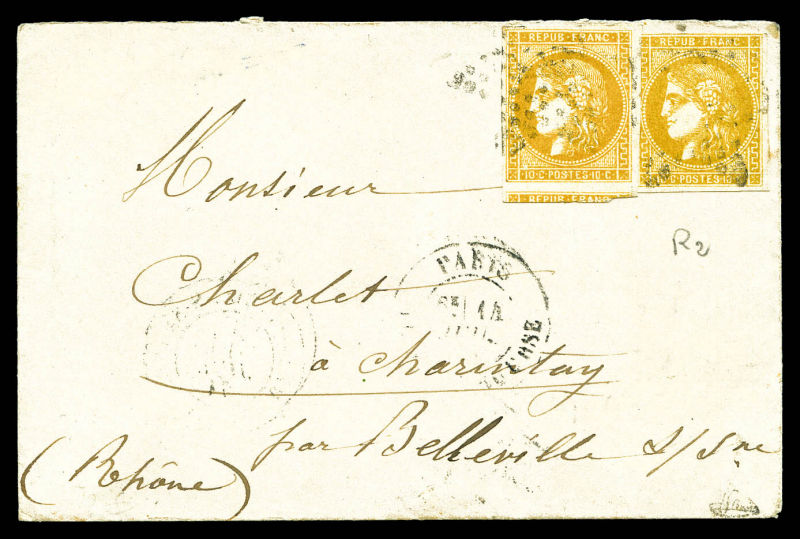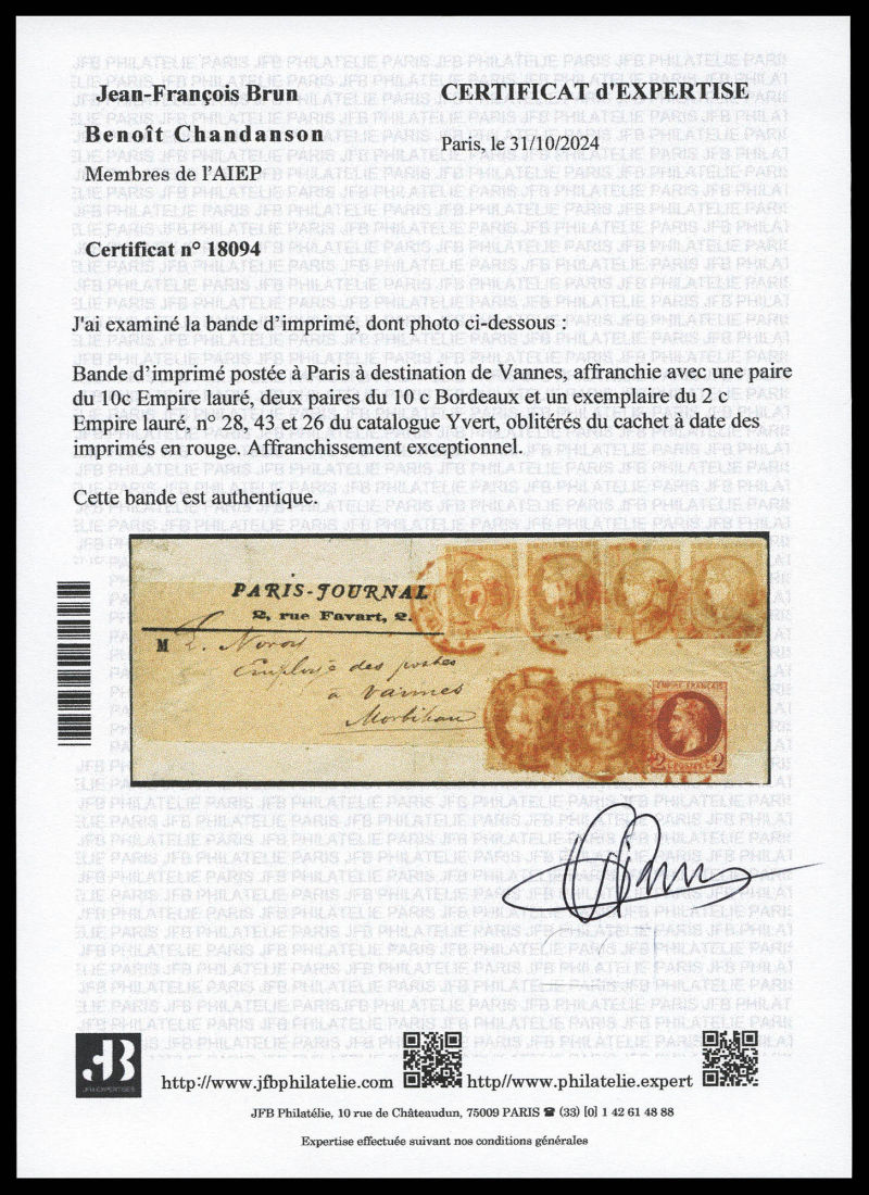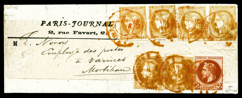 postée à PARIS à destination de Vannes, affranchie avec une paire du 10c lauré, 2 paires du 10c Bordeaux et un exemplaire du 2c Empire lauré, n°28, 43 et 26, oblitérés du cachet à date des imprimés en rouge. AFFRANCHISSEMENT EXCEPTIONNEL. R.R.R.
