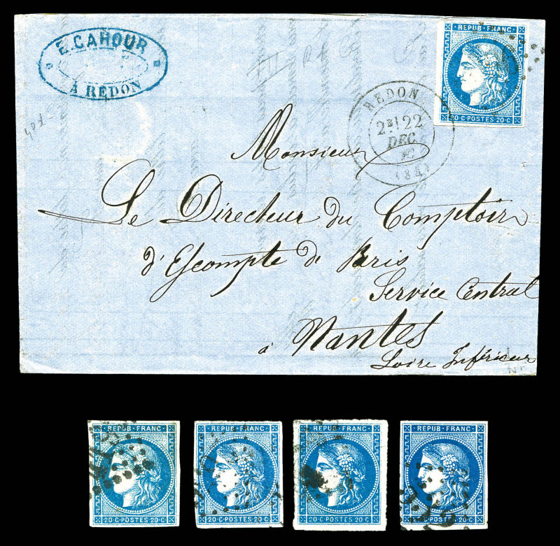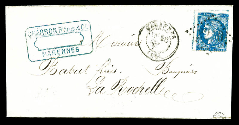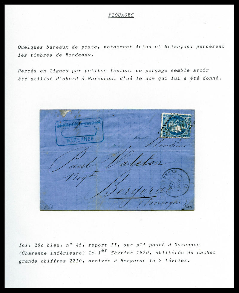 931 imageN°45B, 20c bleu type II Rep 2, percé en ligne sur lettre de MARENNES pour Bergerac. TB (certificat) Qualité: Oblitéré Cote: 400 euros (Image)