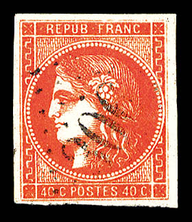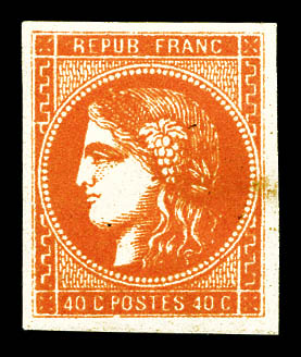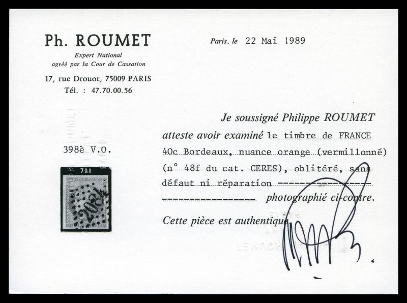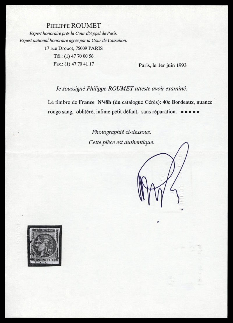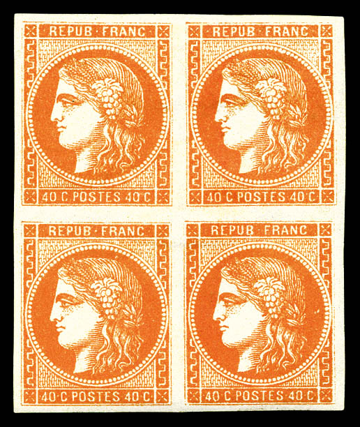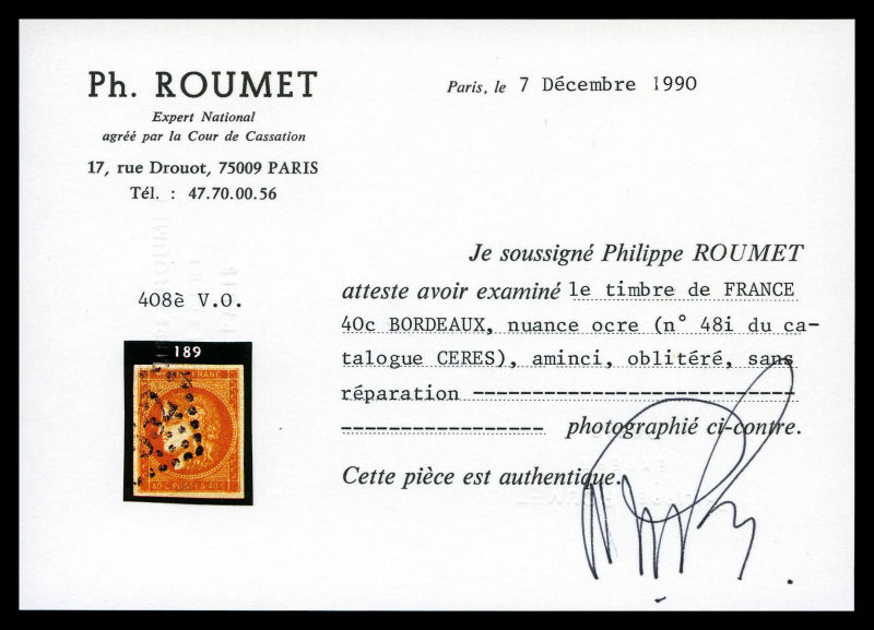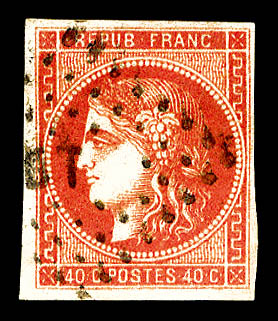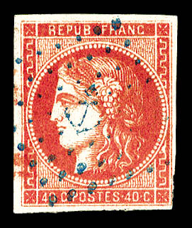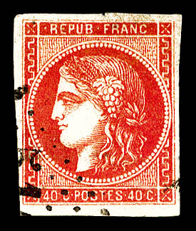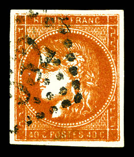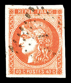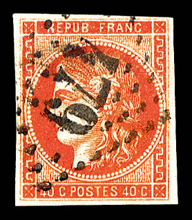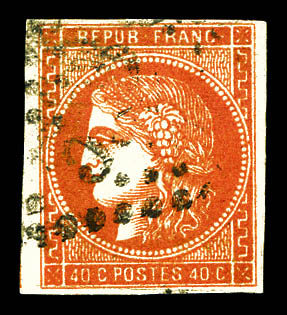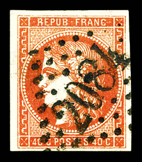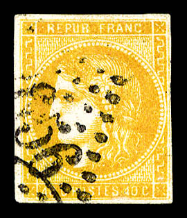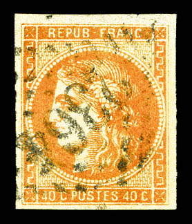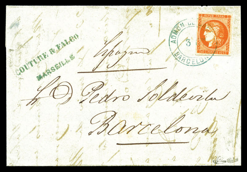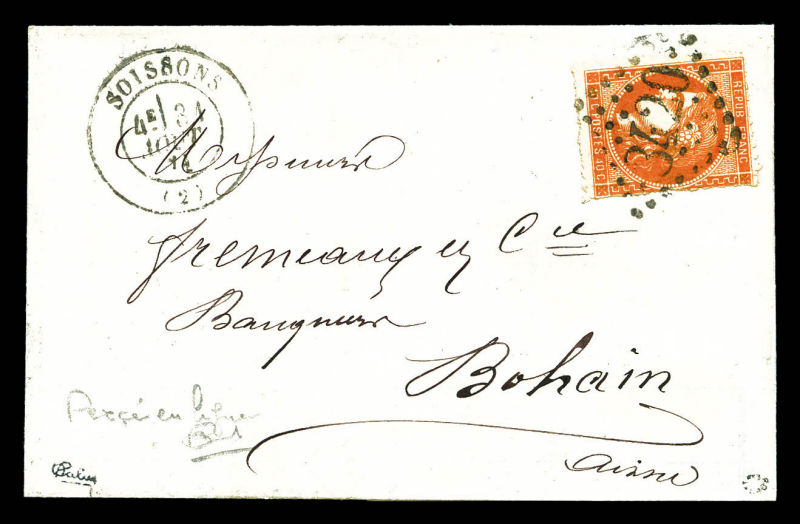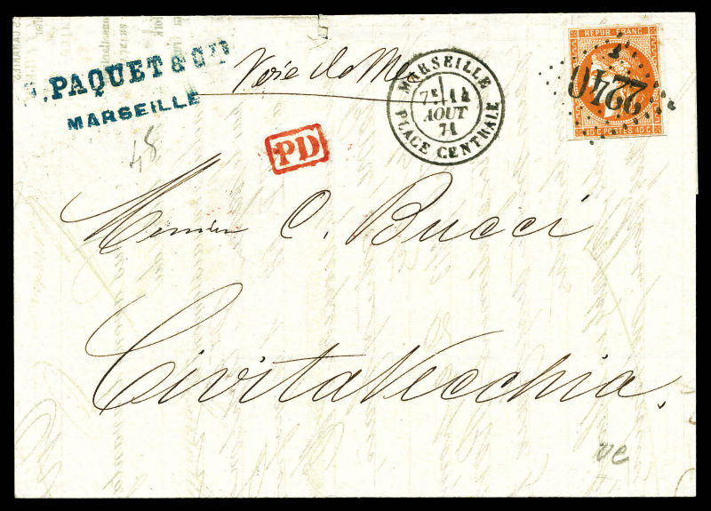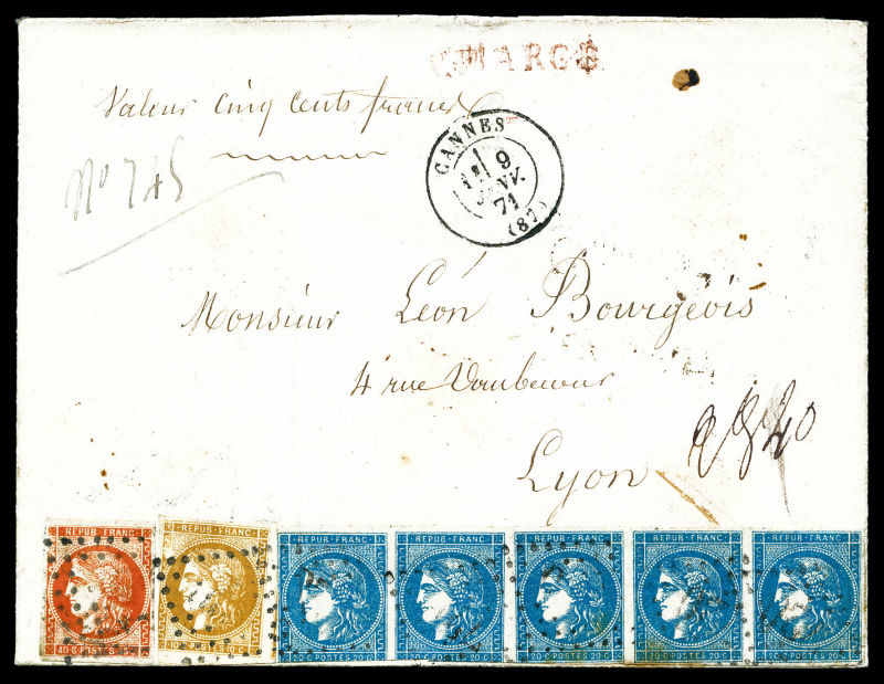 bande de 5 (2 ex. touché) +43A (touché) obl. GC sur lettre chargée de Cannes, Alpes-maritimes, 9 janvier 1871 pour Lyon, TB, RR lettre chargée tricolore tout en Bordeaux. (certificat) Qualité: Oblitéré (Image)