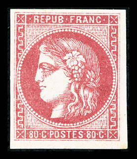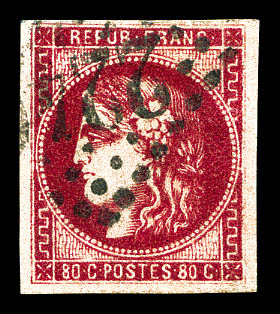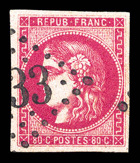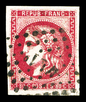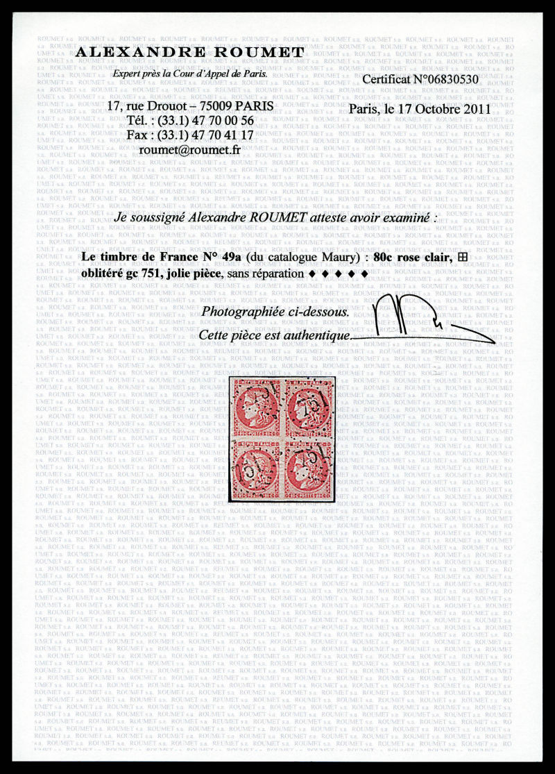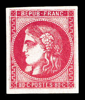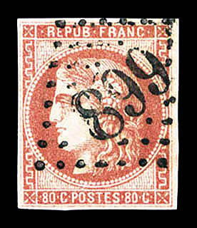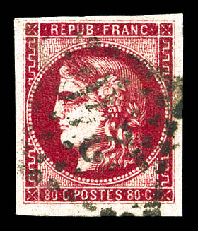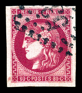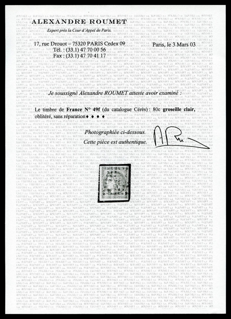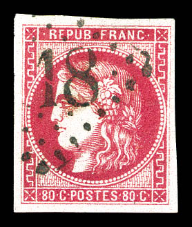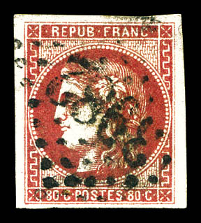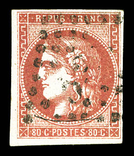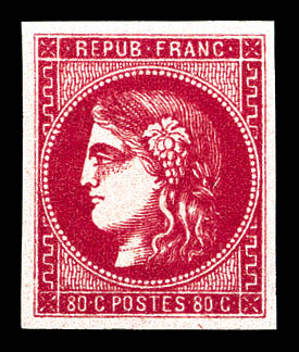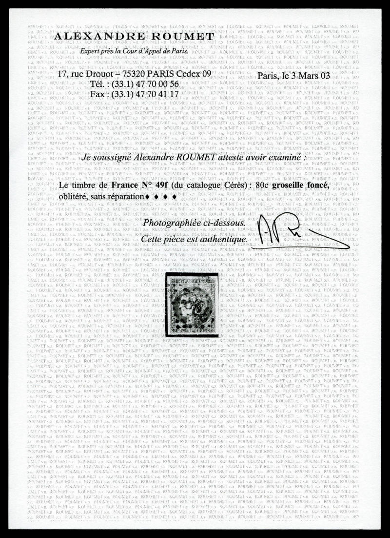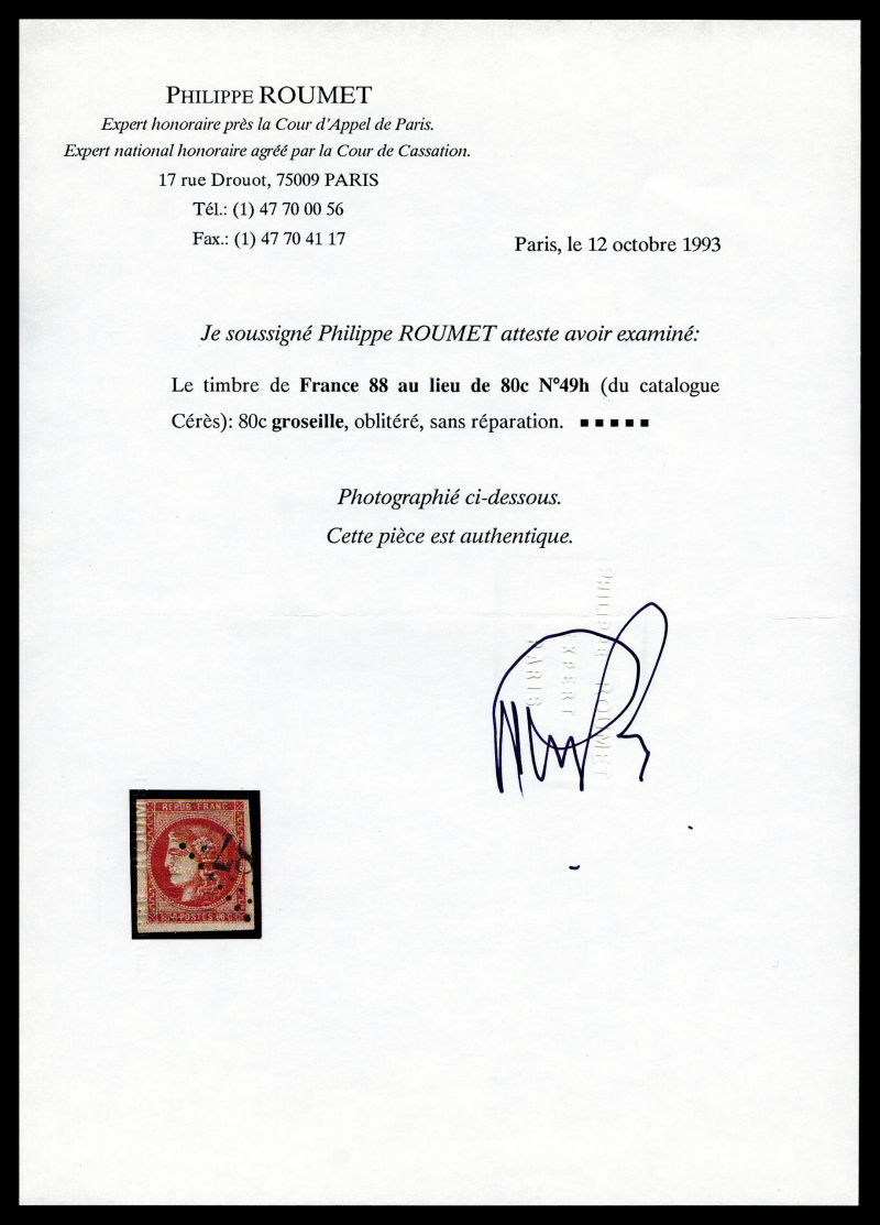 1050 imageN°49f, 80c groseille: 88 au lieu de 80c. TB. R.R. (signé Brun/Calves/Roumet/certificats) Qualité: Oblitéré Cote: 10000 euros (Image) (image2) (All Images)