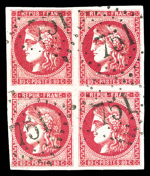 1042 imageN°49a, 80c rose-clair, bloc de quatre obl GC 751. SUP. R. (signé Calves/certificat) Qualité: Oblitéré Cote: 7000 euros (Image) (image2) (image3) (All Images)