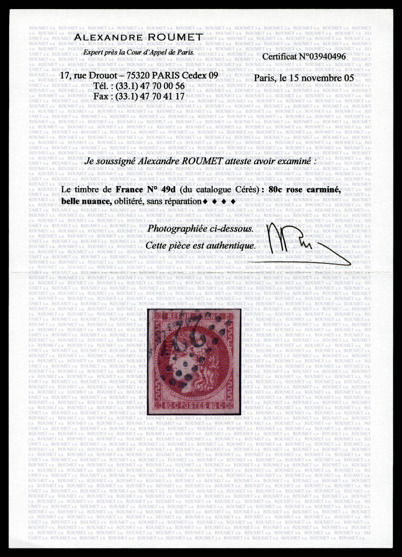 1054 imageN°49h, 80c rose-carminé foncé. Très jolie nuance. SUP. R. (signé Calves/certificat) Qualité: Oblitéré Cote: 1200 euros (Image)