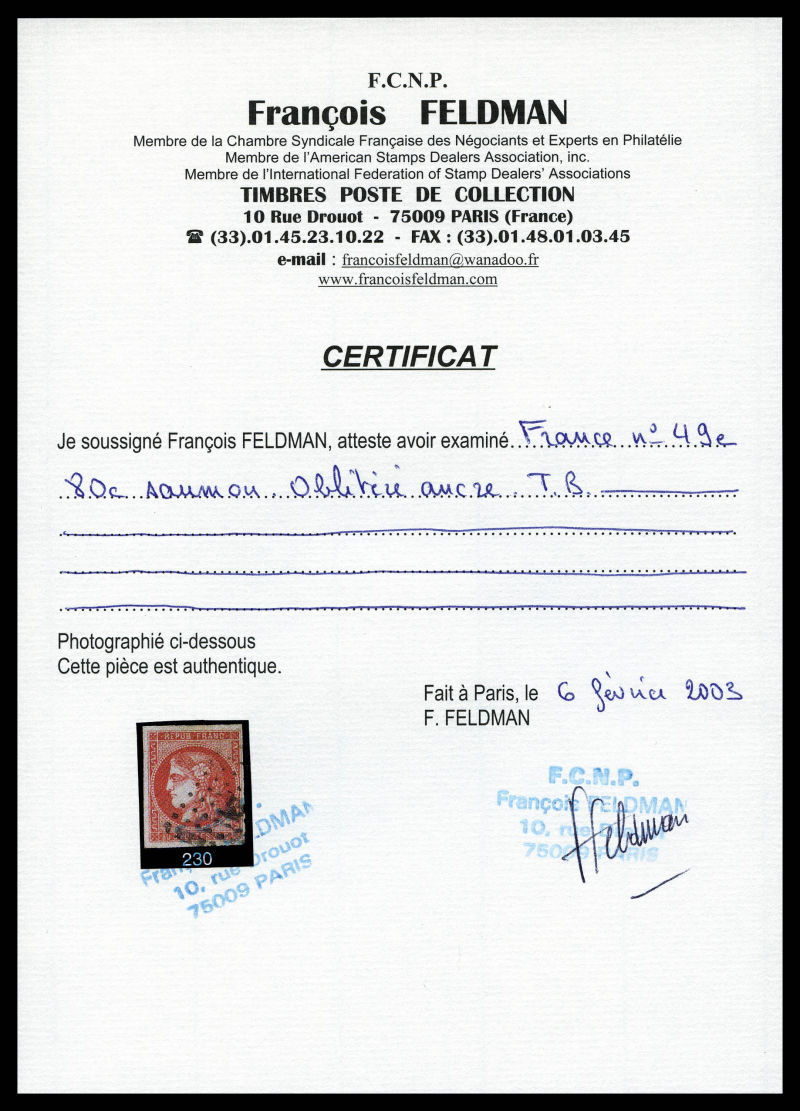 1049 imageN°49e, 80c saumon obl ancre, jolie nuance, TTB. R. (signé Calves/certificats) Qualité: Oblitéré Cote: 3000 euros (Image) (image2) (All Images)