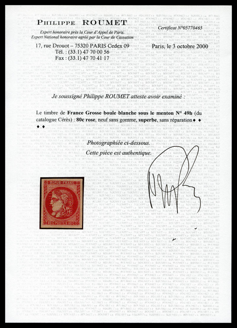 1051 imageN°49g, 80c rose avec variété grosse boule blanche sous le menton. SUPERBE. R.R.R. (signé/certificats) Qualité: (*) Cote: 12500 euros (Image) (image2) (image3) (All Images)
