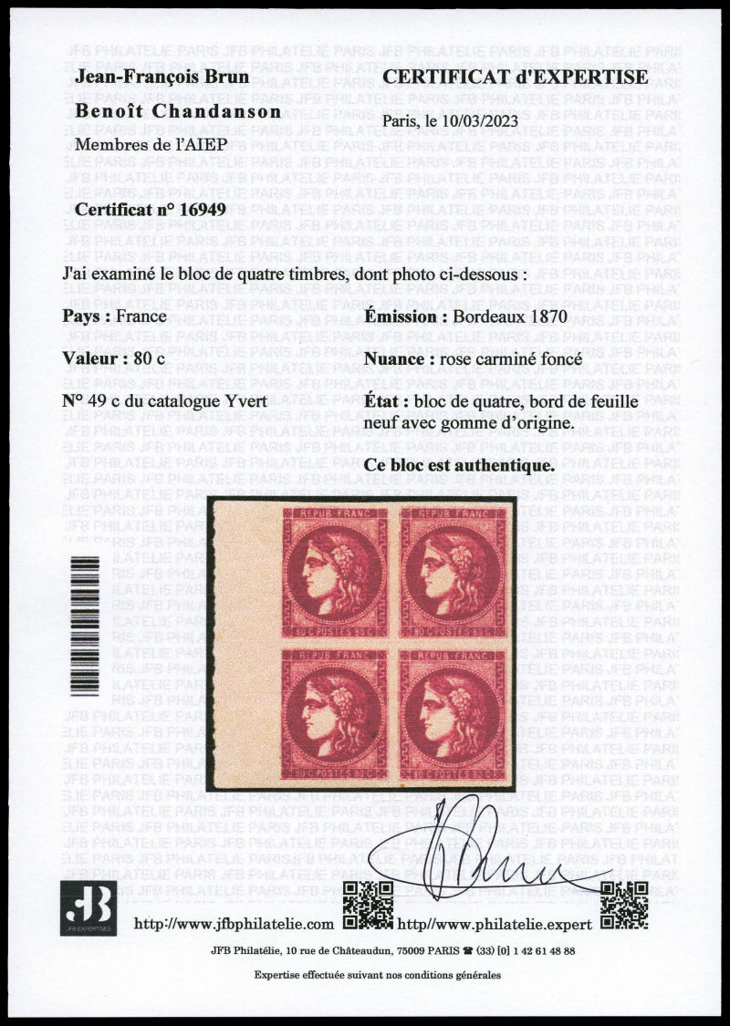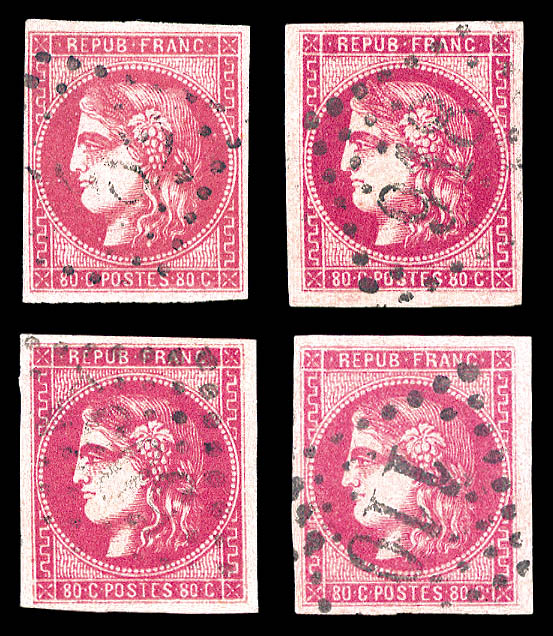 1057 imageN°49, 80c Bordeaux: 4 exemplaires avec nuances différentes. TB (certificat) Qualité: Oblitéré Cote: 1470 euros (Image)