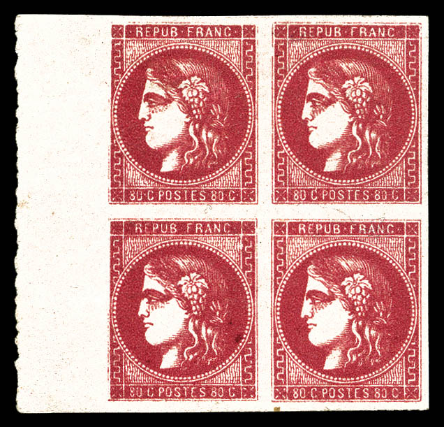 1053 imageN°49h, 80c rose carminé foncé en bloc de quatre bord de feuille latéral, nuance exceptionnelle. SUPERBE. R. (signé Calves/certificats) Qualité: * (Image) (image2) (All Images)