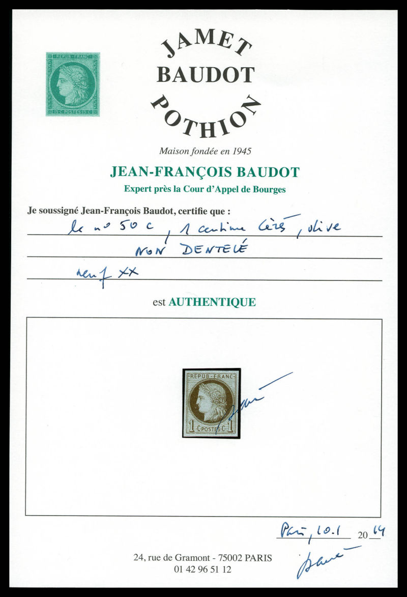 1059 imageN°50c, 1c vert-olive non dentelé. SUP (signé Calves/Certificat) Qualité: ** (Image) (image2) (All Images)