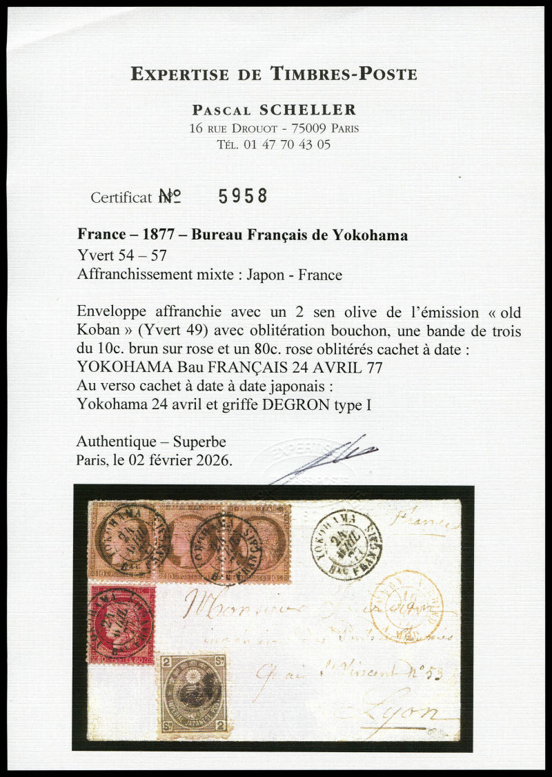 N°54 (gros chiffres) en bande de 3 et N°57 obl càd. YOKOHAMA/Bau FRANCAIS 24 AVRIL 77 avec Japon 2 sen olive de l'émission 'old Koban' N°49 obl cachet muet (bouchon) sur enveloppe pour Lyon avec au verso griffe japonaises DEGRON type I et càd
