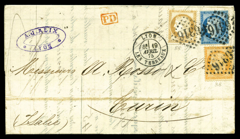1081 imageCérès dentelés: 15c bistre et 25c bleu + 40c Siège (n°38, 55 et 60) sur lettre de LYON le 19 avril 1875 pour TURIN. TTB Qualité: Oblitéré (Image)