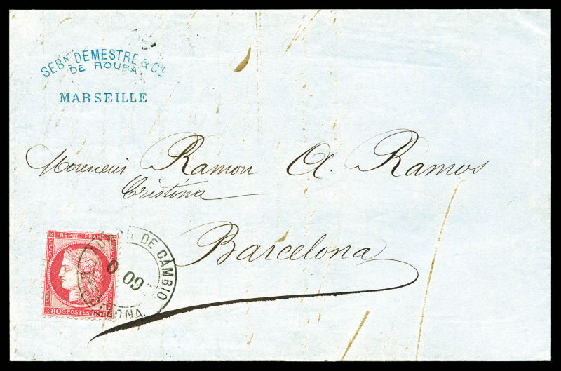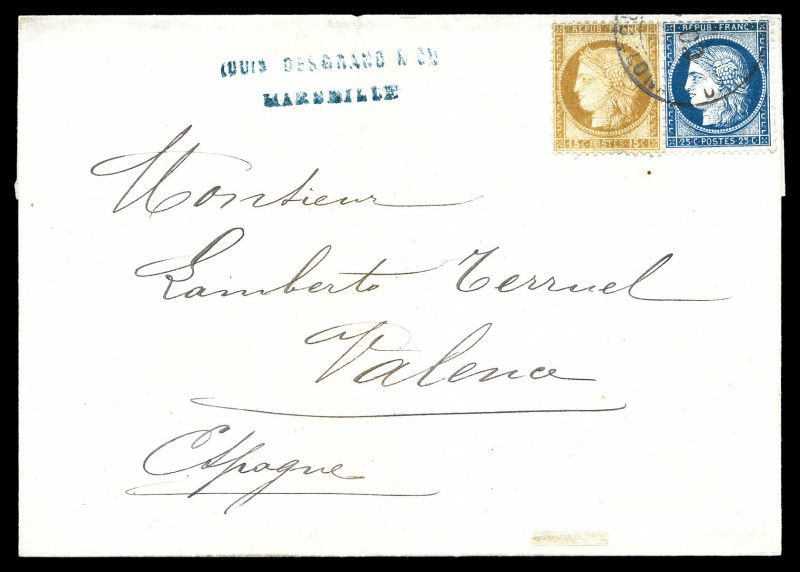 1082 image15c + 25c Cérès (N°55 et 60) obl Cachet ADMON DE CAMBIO/ 009/ BARCELONA' sur lettre de Marseille pour Valence, TTB (certificat) Qualité: Oblitéré (Image) (image2) (All Images)