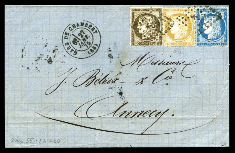1088 imageCérès 15c + 25c + 30c (N°55/56/60): affranchisement tricolore sur lettre de GARE DE CHAMBERY le 27 janv 75 pour ANNECY. TTB Qualité: Oblitéré (Image)