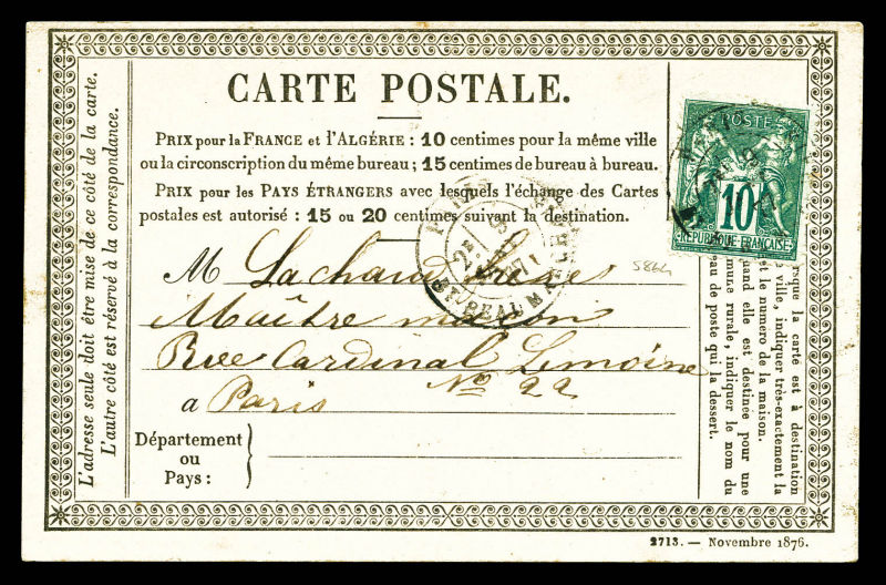 1223 imageN°76, 10c vert type II seul sur carte postale locale du 9 janvier 1877, TB (certificat) Qualité: Oblitéré (Image)
