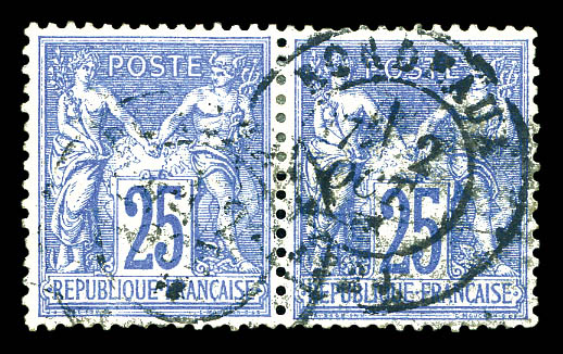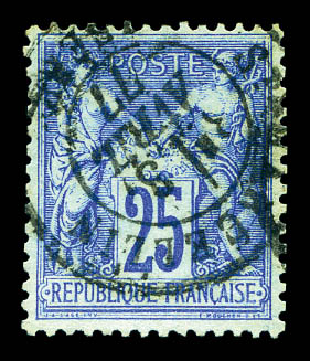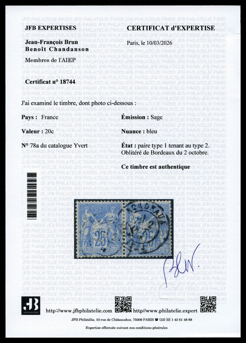 1227 imageN°78a, Sage, 25c outremer: Type I et II se tenant, très bon centrage, SUPERBE ET TRES RARE PIECE (signé Brun/certificats) Qualité: Oblitéré Cote: 24000 euros (Image) (image2) (All Images)