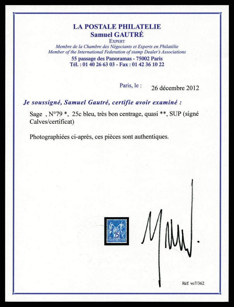 1231 imageN°79, 25c bleu type II, très bon centrage, quasi **, SUP (signé Calves/certificat) Qualité: * (Image) (image2) (All Images)
