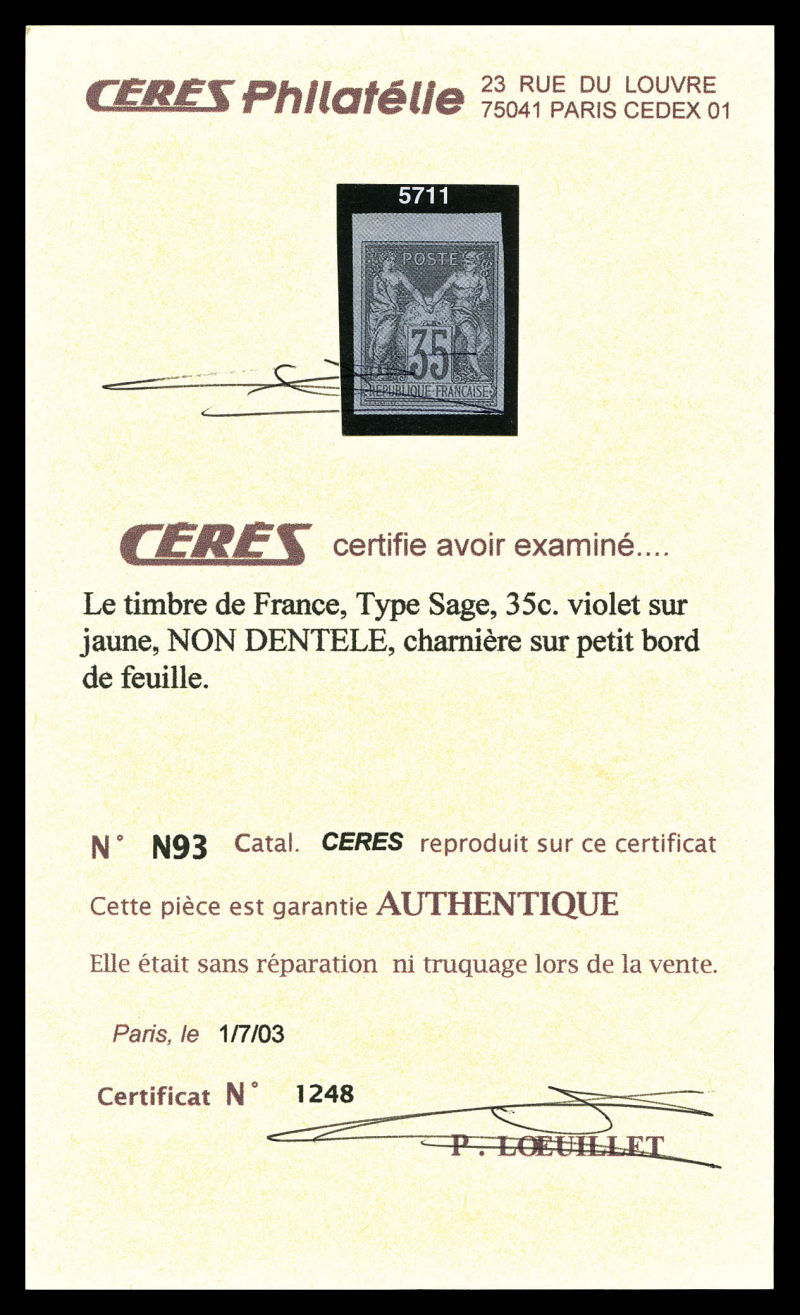 1285 imageN°93b, 35c violet-noir sur jaune Type II non dentelé, bdf. SUP (certificats) Qualité: ** (Image) (image2) (All Images)