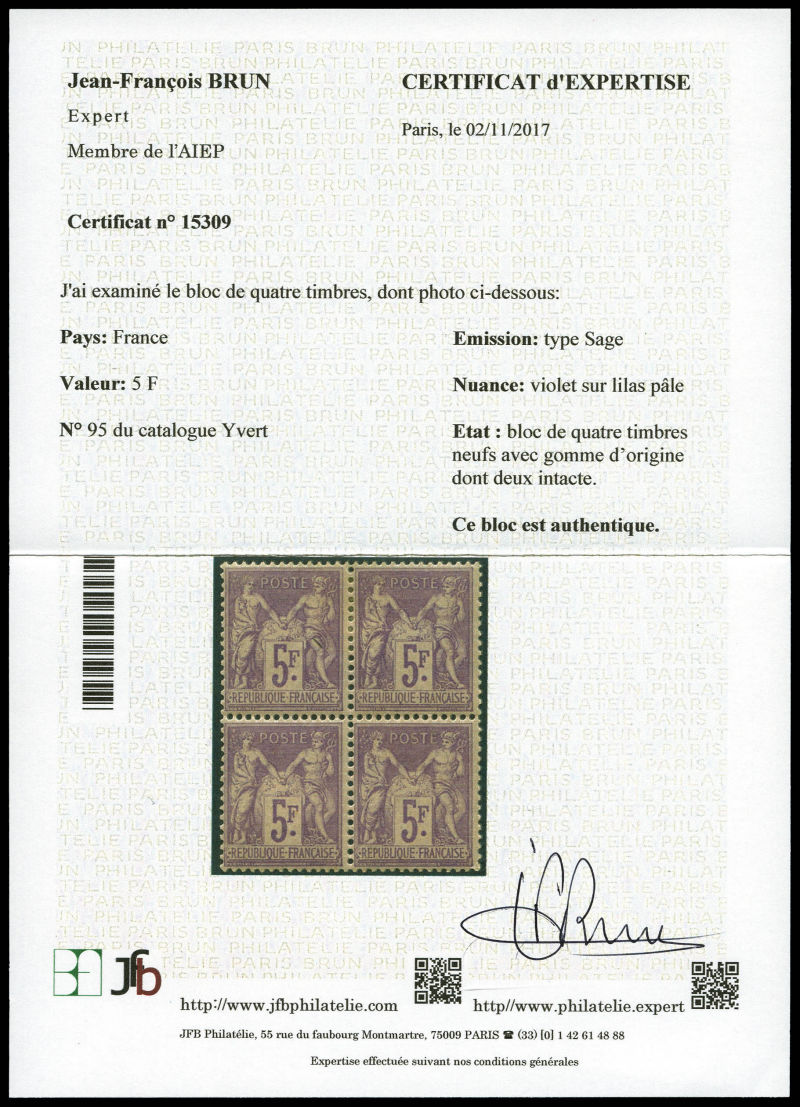 1297 imageN°95a, 5F violet sur lilas, frais et centré. TB (signé Calves/certificat) Qualité: * Cote: 950 euros (Image)