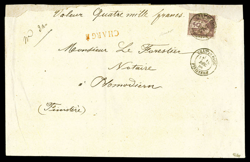 1293 imageN°95, 5 fr violet et lilas obl càd CHATEAUNEUF DU FAOU (Finistère) seul sur lettre chargée pour Chateaulun. TTB. R. (signé Calves/Certificat) Qualité: Oblitéré Cote: 3500 euros (Image)