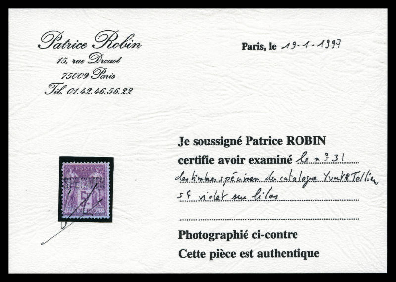 1299 imageN°95d, 5 fr violet sur lilas type II surchargé SPECIMEN. SUP. R.R. (signé Calves/certificats) Qualité: * Cote: 1500 euros (Image) (image2) (All Images)