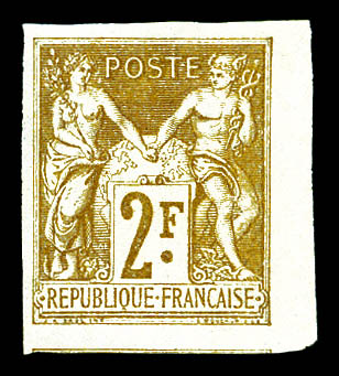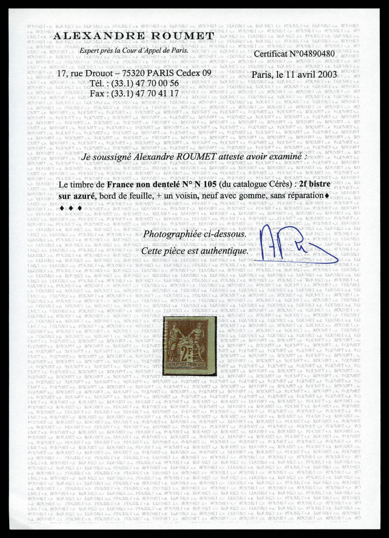 1327 imageN°105a, 2f bistre sur azuré non dentelé, quasi**. SUPERBE. R.R. (signé/certificats) Qualité: * Cote: 3500 euros (Image) (image2) (image3) (All Images)