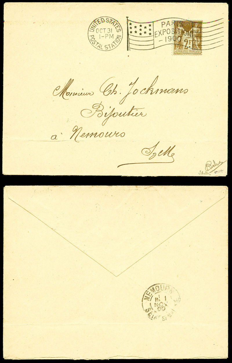 1328 imageN°105, 2F bistre sur azuré oblitéré 'Duplex Drapeau Americain' du 31 oct 1900 seul sur lettre pour Nemours, arrivée le 1er novembre 1900. SUP. R.R. (signé Scheller/Calves/certificat) Qualité: Oblitéré Cote: 5500 euros (Image)