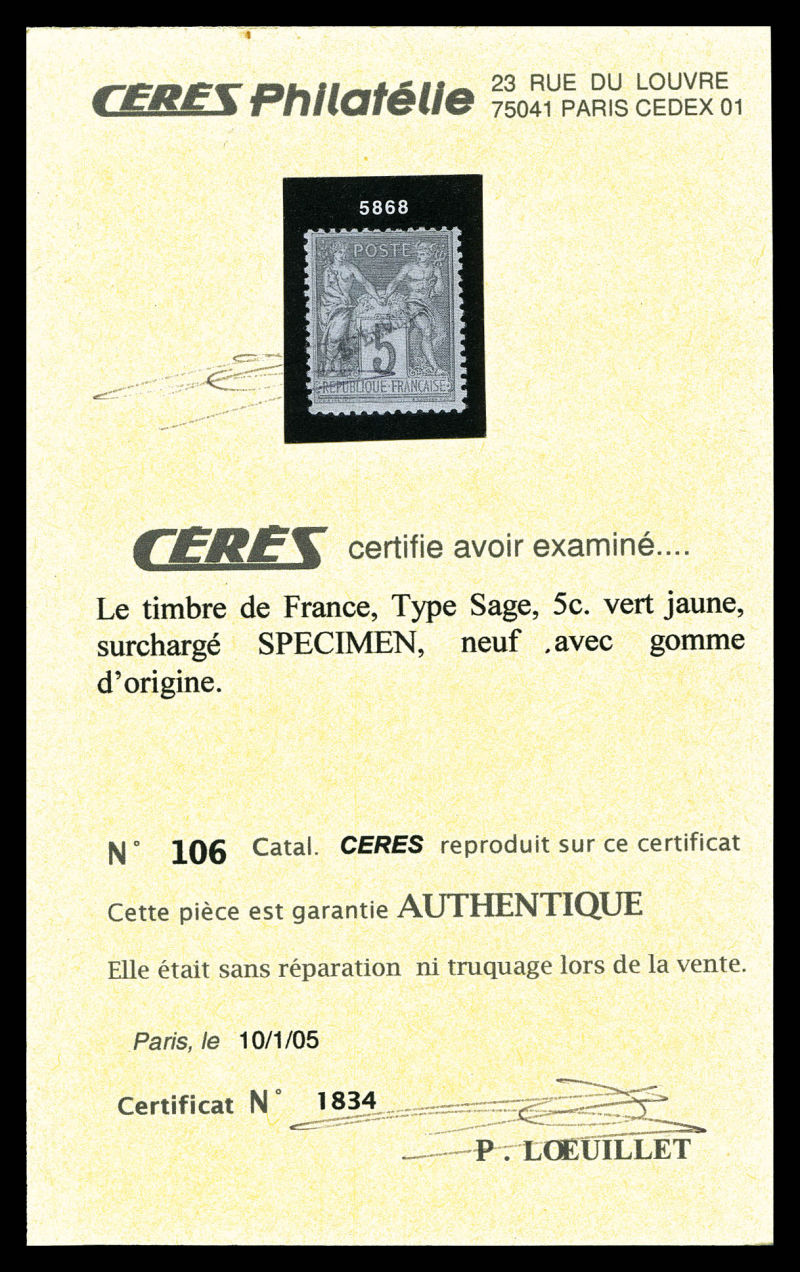 1331 imageN°106, 5c vert-jaune type II surchargé SPECIMEN. SUP. R. (signé Calves/certificats) Qualité: * (Image) (image2) (All Images)