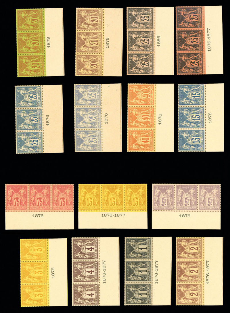 1332 imageType Sage, 1900, Tirage de l'Atelier des timbres sur bristol avec dentelure figurée, 15 valeurs en bande de 3 avec date dans la marge inférieure sous l'exemplaire central (dont le 15c jonquille, les quatre 25 et le 5f). SUPERBE. R.R. (certificat) Qualité: (*) Cote: 8250+ euros (Image)