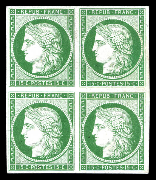 1340 imageN°2, Cérès 1849, 15c vert sur papier carton en bloc de quatre. SUP. R. (certificat) Qualité: (*) Cote: 1600 euros (Image)